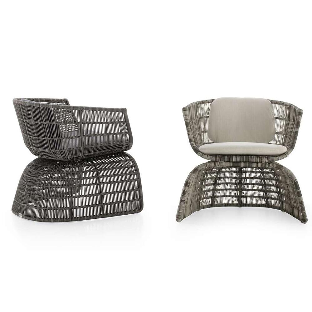 Small armchairs, armchairs, chairs and a stool are designed in several different shapes and heights. The polyethylene fibre interlacing are joined by natural or bronze abaca.